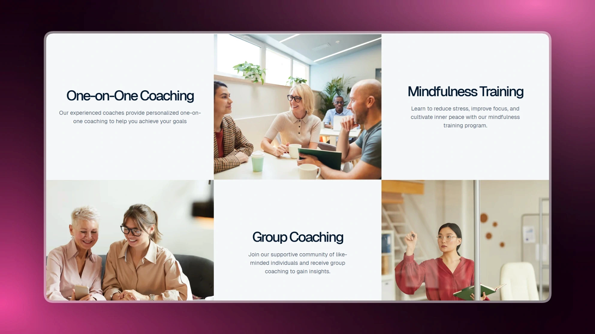 Structured sections to explain coaching services without overwhelming the user